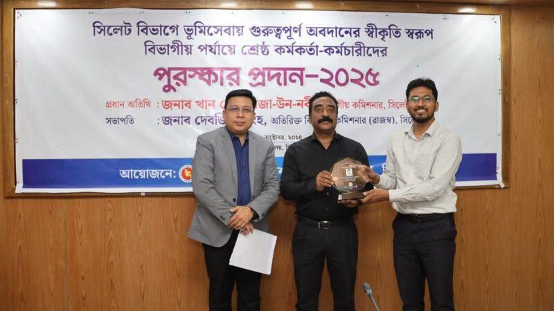 মোঃ হারুন অর রশিদ-: ভূমি সেবায় গুরুত্বপূর্ণ অবদানের স্বীকৃতিস্বরপ বিভাগীয় প্যায়ে শ্রেষ্ঠ সহকারী কমিশনার (ভূমি) নির্বাচিত হয়েছেন জামালপুর জলার বকশীগঞ্জ উপজেলা নির্বাহী অফিসার (ইউএনও) শাহ জহুরুল হােসেন। সিলেট বিভাগে সহকারী কমিশনার (ভূমি) হিসেবে তাঁর অসামান্য অবদানের জন্য তাঁকে এই মর্যাদাপূর্ণ সম্মাননা প্রদান করা হয়। শনিবার (২৫ অক্টোবর) দুপুরে সিলেট বিভাগীয় কমিশনার কার্যালয়ে এক অনাড়ম্বর অনুষ্ঠানে শাহ জহুরুল হােসেনের হাতে সম্মাননা ক্রেস্ট ও সনদপত্র তুলে দেন সিলেট বিভাগীয় কমিশনার খান মােঃ রেজা-উন- নবী। জানা যায়, সিলেট বিভাগের হবিগঞ্জ জেলার কুলাউড়া উপজেলাতে সহকারী কমিশনার (ভূমি) হিসেবে দায়িত্ব পালনকালে ভূমি ব্যবস্থাপনায় স্বচ্ছতা, গতিশীলতা ও জনমুখী সেবা নিশ্চিতকরণে শাহ জহুরুল হােসেন ভূমিকা রাখেন। তাঁর আন্তরিকতা ও দায়িত্বশীলতার ফলেই তাঁকে বিভাগীয় শ্রষ্ঠত্বের এই স্বীকৃতি দেওয়া হয়। পুরস্কার গ্রহণের পর বর্তমান বকশীগঞ্জ উপজেলা নির্বাহী অফিসার শাহ জহুরুল হাসেন বলেন,”এই সম্মান কেবল আমার ব্যক্তিগত অর্জন নয়; এটি মাঠ প্রশাসনের প্রতিটি কর্মকর্তা-কর্মচারীর কঠোর পরিশ্রম ও দায়িত্বশীলতার প্রতিফলন। আমি সব সময় জনগণের সেবাকে সর্বোচ্চ গুরুত্ব দিয়ে কাজ করার চেষ্টা করেছি এবং ভবিষ্যতেও সেই ধারা অব্যাহত থাকবে।”