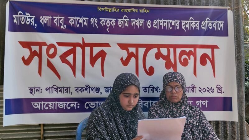 সংবাদ সম্মেলনে ইদ্রিস আলীর স্ত্রী সখিনা আক্তার জোসনা ও মেয়ে জান্নাতুল ফেরদৌসী ইভা অভিযোগ করেন, স্থানীয় প্রভাবশালী মতিউর, ধলা বাবু ও কাশেম গং দীর্ঘদিন ধরে তাদের জমি দখলের চেষ্টা চালাচ্ছে। গত ১০ জানুয়ারি অভিযুক্তরা দেশীয় অস্ত্র নিয়ে তাদের জমিতে প্রবেশ করে প্রায় ৭০ হাজার টাকার গাছ কেটে ফেলে এবং ঘর তোলার চেষ্টা করে। বাধা দিতে গেলে তাদের খুনের হুমকি দেওয়া হয়।