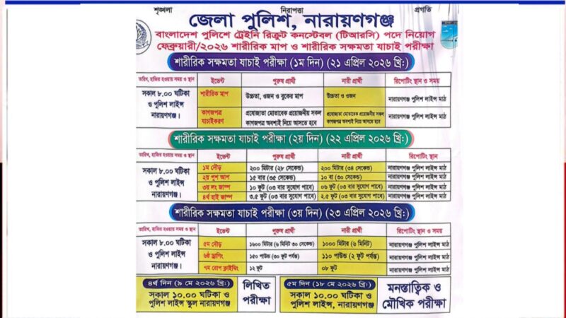 বাংলাদেশ পুলিশে ট্রেইনি রিক্রুট কনস্টেবল (টিআরসি) পদে নিয়োগ উপলক্ষে নারায়ণগঞ্জে প্রার্থীদের শারীরিক সক্ষমতা যাচাই পরীক্ষা অনুষ্ঠিত হতে যাচ্ছে। জেলা পুলিশ, নারায়ণগঞ্জের আয়োজনে আগামী ২১, ২২ ও ২৩ এপ্রিল ২০২৬ তারিখে তিনদিনব্যাপী এ পরীক্ষা অনুষ্ঠিত হবে।